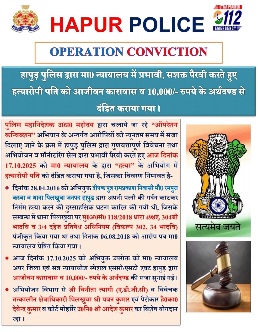 एडीजीसी विनीता त्यागी ने बताया कि पिलखुवा कोतवाली क्षेत्र के मोहल्ला रमपुरा निवासी दीपक पुत्र राम प्रकाश ने 28 अप्रैल 2016 को अपनी पत्नी की गर्दन काट कर निर्मल हत्या कर दी थी। इसके बाद पिलखुवा पुलिस ने मामले में हत्या और दहेज प्रतिषेध अधिनियम के तहत मुकदमा दर्ज किया था। छह अगस्त 2018 को पुलिस ने आरोप पत्र न्यायालय में प्रेषित किया। इसके पश्चात शुक्रवार को सुनवाई के दौरान अदालत ने हत्या के अभियोग में हत्यारोपी पति को दोषी मानते हुए उसे आजीवन कारावास व 10,000 रुपए के अर्थ दंड से दंडित किया है। ऑपरेशन कनविक्शन अभियान के तहत न्यूनतम समय में सजा दिलाए जाने के क्रम में प्रभावी पैरवी की गई। विवेचक तत्कालीन क्षेत्राधिकारी पिलखुवा पवन कुमार, पैरोकार हेड कांस्टेबल देवेंद्र कुमार, कोर्ट मोहर्रिर दरोगा आदेश कुमार का विशेष योगदान रहा।