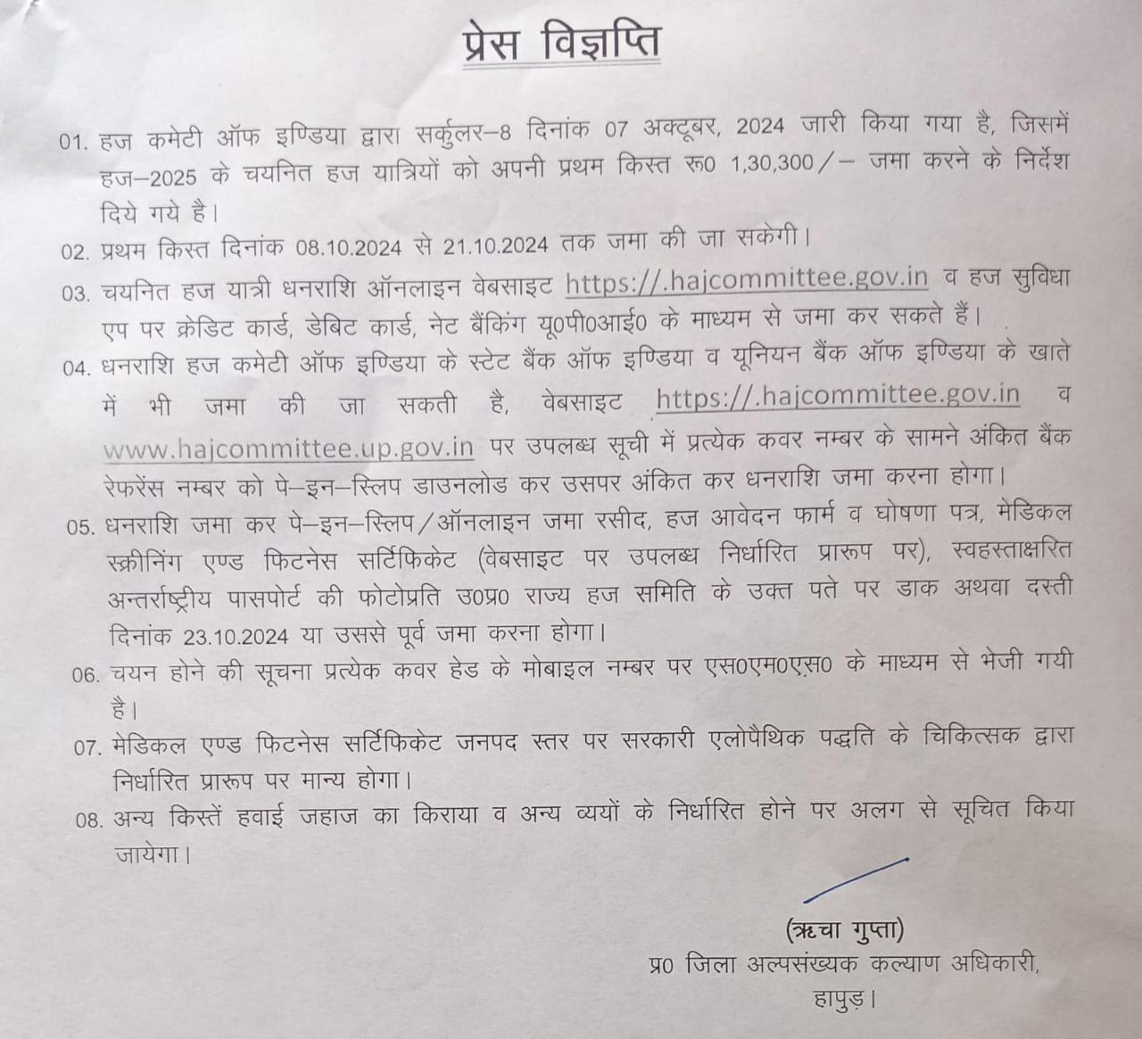 हापुड सूवि(ehapurnews.com):हापुड के जिला अल्पसंख्यक समाज कल्याण अधिकारी ने एक प्रेसनोट जारी कर हज यात्रियों के एक खास खबर बताई है।1. हज कमेटी ऑफ इण्डिया द्वारा सर्कुलर 8 दिनांक 07 अक्टूबर, 2024 जारी किया गया है, जिसमे हज-2025 के चयनित हज यात्रियों को अपनी प्रथम किस्त रू0 1,30,300/- जमा करने के निर्देश दिये गये है।
