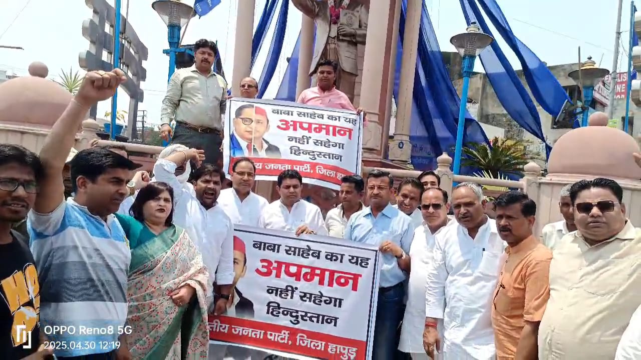 उत्तर प्रदेश भारतीय जनता पार्टी के आह्वान पर भाजपा के जिलाध्यक्ष नरेश तोमर व दलित नेत्री अलका निम की अगुवाई में सुयश वशिष्ठ, मोहन सिंह, मोनू गर्ग सहित सैकड़ों कार्यकर्ता बुधवार को हापुड़ में डा.अम्बेडकर की प्रतिमा पर पहुंचे और माल्यार्पण किया। भाजपा के जिलाध्यक्ष नरेश तोमर व दलित नेत्री अलका निम ने कहा कि बाबा साहेब के समक्ष सपा नेता अखिलेश यादव को बता कर बाबा साहेब का अपमान किया है। डा.अम्बेडकर देशवासियों के लिए एक ऐसा व्यक्तित्व है जिसकी अन्य से तुलना नहीं की जा सकती। उनके आदर्श अनुकरणीय व प्रेरणादायी है। भारतीय जनता पार्टी, सपा के इस कृत्य की घोर निंदा करती है। सपा नेताओं को अपने कृत्य के लिए देशवासियों व बहुंजन समाज से माफी मांगनी चाहिए।