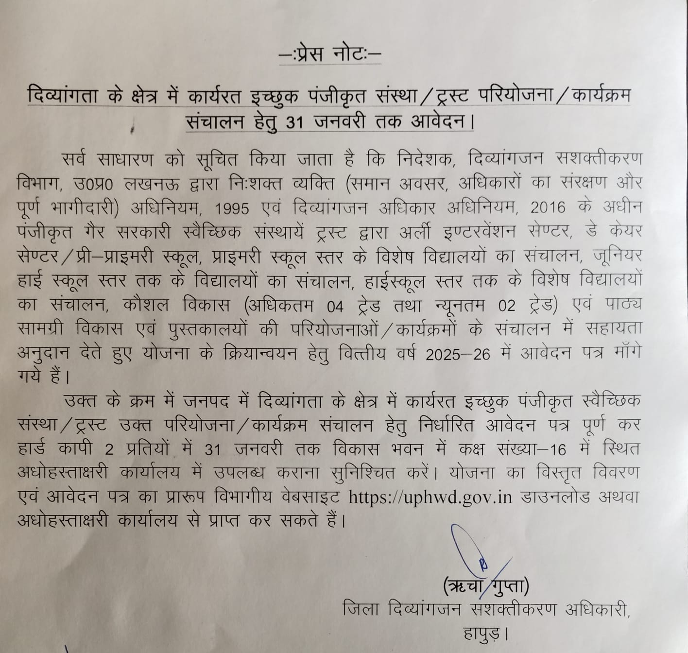 उक्त के क्रम में जनपद में दिव्यांगता के क्षेत्र में कार्यरत इच्छुक पंजीकृत संस्था / ट्रस्ट परियोजना / कार्यक्रम संचालन हेतु निर्धारित आवेदन पत्र पूर्ण कर हार्ड कापी 2 प्रतियों में 31 जनवरी तक विकास भवन में कक्ष सख्या-16 में स्थित अधोहस्ताक्षारी कार्यालय में जमा कराना सुनिशिचत करें | योजना का विस्तृत विवरण एवं आवेदन पत्र का प्रारूप विभागीय वेबसाइट https://uphwd.gov.in डाउनलोड अथवा अधोहर्ताक्षरी कार्यालय से प्राप्त कर सकते हैं। यह जानकारी जिला दिव्यांगजन संशक्तीकरण अधिकारी हापुड़ द्वारा दी गई है।