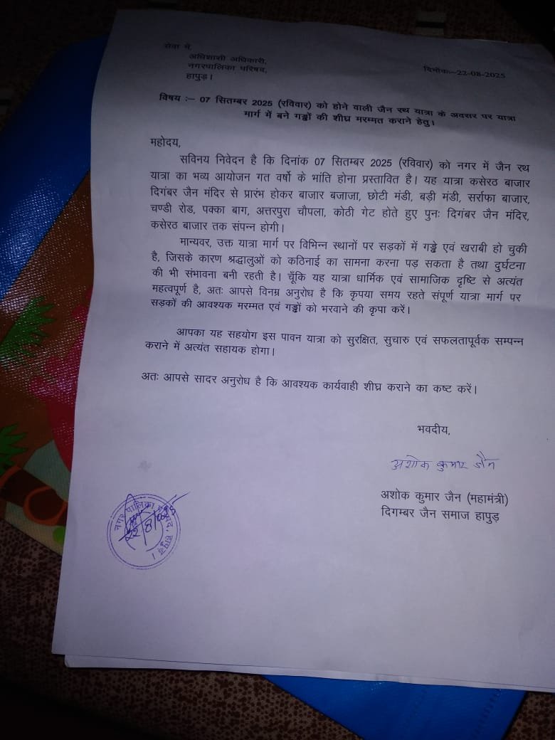 जैन समाज ने नगर पालिका हापुड से जैन रथयात्रा मार्ग के गड्डो को भरवाने की मांग की