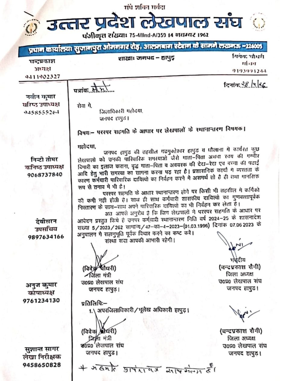 हापुड़, सीमन/अशोक तोमर (ehapurnews.com): उत्तर प्रदेश लेखपाल संघ जनपद हापुड़ के पदाधिकारियों चंद्र प्रकाश सैनी अध्यक्ष, विवेक चौधरी जिला मंत्री आदि ने मंगलवार को जिलाधिकारी को एक पत्र लिख कर लेखपालों के परस्पर तबादले वाली मांग पर कार्रवाई करने की मांग की है। पत्र में सघ ने लिखा है कि परस्पर तबादले होने से लेखपालों पर घर के दायित्व निर्वाह की जरुरत पूरी होगी, साथ ही सरकारी कार्य को गति मिलेगी।
