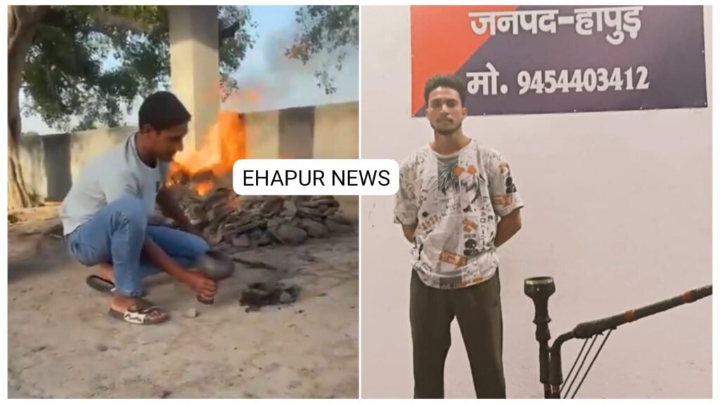हापुड़,सीमन/संजय कश्यप(ehapurnews.com): हापुड़ के हाफिजपुर पुलिस ने चिता से चिलम भरने के मामले में एक आरोपी को गिरफ्तार किया है। बताया जा रहा है कि मामले में तीन आरोपी फरार है जिनकी गिरफ्तारी के लिए पुलिस दबिश दे रही है। गिरफ्तार किए गए आरोपी का नाम अभिषेक है।दरअसल हाफिजपुर क्षेत्र की एक वीडियो सोशल मीडिया पर हुई। वायरल वीडियो में एक युवक जलती चिता से हुक्का सुलगाता हुआ दिखाई दे रहा है। युवक की घिनौनी हरकत से लोगों में बेहद नाराजगी है जिसके बाद पुलिस ने मामले में कार्रवाई करते हुए आरोपी अभिषेक को गिरफ्तार कर लिया जिससे हुक्का भी पुलिस ने बरामद किया है। मामले में तीन साथी फरार बताए जा रहे हैं। पुलिस मामले की जांच कर रही है।