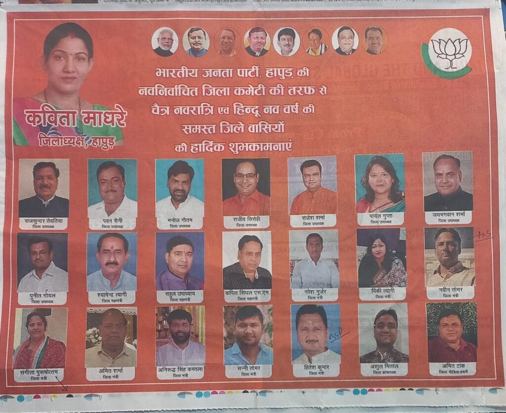 भाजपा जिला कार्य समिति ने जनपद के तीनों विधायकों गढ़ से हरेंद्र तेवतिया, हापुड़ से विजयपाल आढ़ती तथा धौलाना से धर्मेश तोमर की पूरी तरह से उपेक्षा करते हुए इश्तहार में कोई प्रमुखता नहीं दी है।