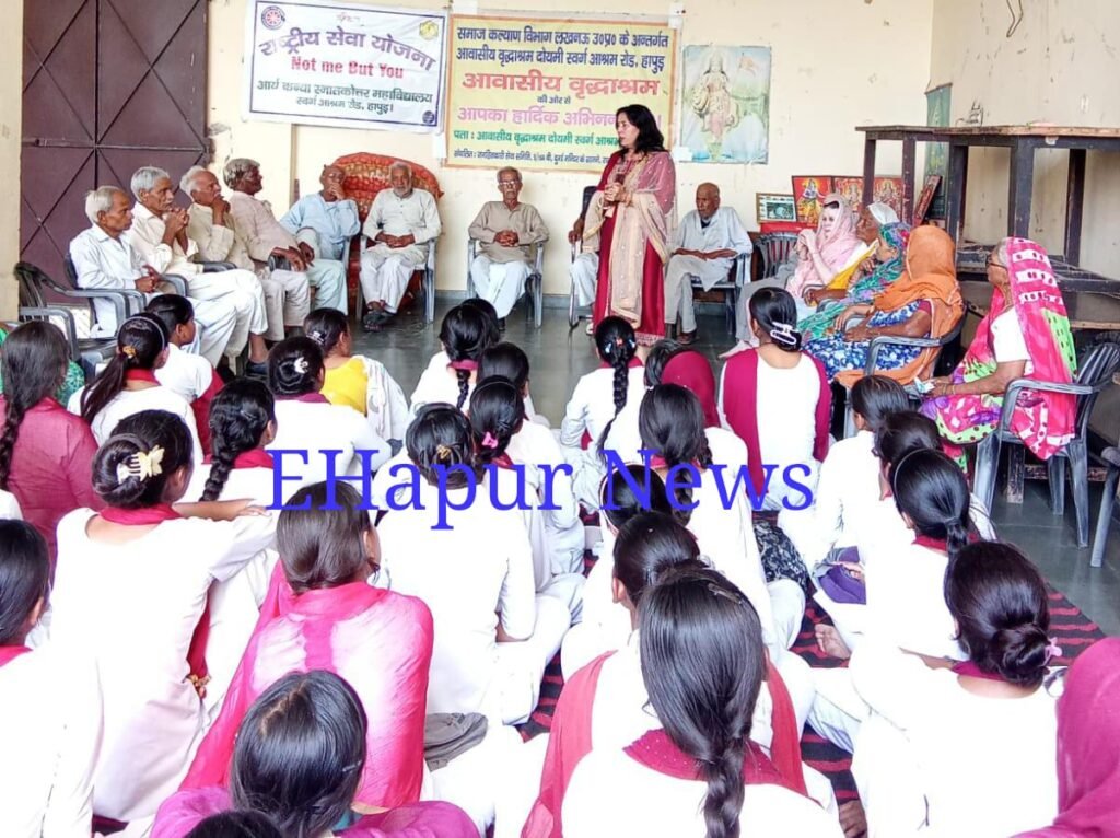 हापुड, सीमन (ehapurnews.com):हापुड के आर्य कन्या स्नातकोत्तर महाविद्यालय की राष्ट्रीय सेवा योजना इकाई के तत्वावधान में गांव दोयमी में लगने वाले सात दिवसीय शिविर के पांचवे दिन गुरूवार को शिविर स्थल के परिसर में स्थित मंदिर में पूजा अर्चना के साथ किया गया । छात्राओं ने योगासन किया व लक्ष्य गीत गया। स्वयंसेविकाएं कार्यक्रम अधिकारी के साथ दोयमी गांव में स्थित वृद्धाश्रम में भ्रमण के लिए गई। राष्ट्रीय सेवा योजना का उद्देश्य युवाओं को सामाजिक भागीदारी के लिए तैयार करना है इस प्रयास में सभी स्वयंसेविकाओं के सामाजिक मूल्यों का विकास करने के लिए वृद्धाश्रम में सेवा कर अनुभव प्राप्त किया ।सर्वप्रथम सभी स्वयंसेविकाओं ने वृद्धाश्रम में श्रमदान कर स्वच्छता अभियान चलाया। वृद्धाश्रम परिसर की साफ सफाई की गई ।तत्पश्चात सभी स्वयंसेविकाओं ने वृद्धाश्रम में स्थित बगीचे में औषधि पौधे लगाए। स्वयंसेविकाओं ने सभी वृद्धजनों से उनके जीवन के अनुभव जानें। वृद्धोंजनों ने उन्हें अपनी अनुभवों से जीवन का ज्ञान प्रदान किया। स्वयंसेविकाओं ने वृद्धाश्रम में मनोरंजन करने के लिए सांस्कृतिक कार्यक्रम प्रस्तुत किये निशा व सोनिका ने राधा कृष्ण नृत्य प्रस्तुत किया कुमारी राधिका ने भजन प्रस्तुत किया। जिकरा और कंचन ने अपने कार्यक्रम के माध्यम से सभी का मनोरंजन किया। संस्कृतिक कार्यक्रम के माध्यम से स्वयंसेविकाओं ने वृद्धाश्रम में उल्लास का वातावरण पैदा कर दिया। दोपहर भोजन के पश्चात स्वयंसेविकाओं ने वृद्धजनों के साथ धार्मिक गीतों पर अंताक्षरी का आयोजन किया जिसमें सभी वृद्धजनों ने भाग लिया। सभी वृद्धजनों के चेहरे पर खुशी थी जिससे स्वयं सेविकाओं ने स्वयं को बहुत ही आनंदित महसूस किया तथा सभी स्वयंसेविकाओं ने सभी वृद्धजनों को वस्त्र वह फल वितरित किए।कार्यक्रम अधिकारी ने सभी स्वयंसेविकाओं को उनके इस सामाजिक कार्य के लिए शुभकामनाएं दी व उनके इस प्रयास की तारीफ की। । कार्यक्रम अधिकारी डॉक्टर सर्वेश कुमारी ने बुजुर्गों को हमारे समाज की धरोहर व अनुभवों का खजाना बताया।इस प्रयास में सहयोग करने के लिए वृद्धाश्रम इंचार्ज श्रीमती पूनम व सभी स्वयंसेविकाओं का आभार ज्ञापन किया।