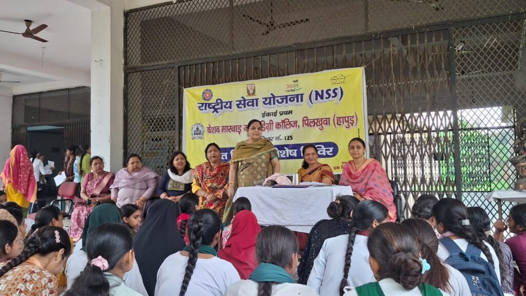 हापुड़, सीमन (ehapurnews.com): केशव मारवाड़ गर्ल्स डिग्री कॉलेज पिलखुआ में राष्ट्रीय सेवा योजना इकाई के सात दिवसीय शिविर के पांचवें दिन कार्यक्रम अधिकारी डॉ शशी शर्मा ने “स्वास्थ्य है तो सब कुछ है, नहीं तो कुछ भी नहीं” विषय पर एक संगोष्ठी का आयोजन किया जिसमें डॉ प्रीति कौशिक ने स्वयं सेविकाओं को महिलाओं को शिशुओं के स्वास्थ्य और टीकाकरण संबंधी जानकारी दी। उन्होंने कहा स्वस्थ शरीर में ही स्वस्थ मस्तिष्क का निर्माण होता है। इसके बाद स्वयं सेविकाओं ने डॉ. शशि शर्मा के निर्देशन में महिलाओं को स्वास्थ्य और टीकाकरण संबंधी जानकारी प्रदान की। शिविर के द्वितीय सत्र बौद्धिक सत्र में समाज सेविका निर्मल शर्मा ने लड़कियों के आचरण, पहनावे, घर परिवार का ध्यान रखने, बड़ों के आदर सत्कार, नियंत्रित भाषा और सफल ग्रहणी ही एक अच्छे समाज और देश का निर्माण कर सकती है जैसे विभिन्न बिंदुओं पर प्रकाश डालते हुए भविष्य के लिए शुभकामनाएं दी। उन्होंने यह भी बताया की शिक्षा मात्र डिग्री हासिल करना नहीं है बल्कि ज्ञान प्राप्त करना है। कनिका, कनिष्क, सोफिया, डिंपल, सोनिया, मुस्कान, प्राची, पारुल, पायल, रिया, रमा आदि स्वयं सेविकाओं ने सभी बिंदुओं पर चर्चा की।