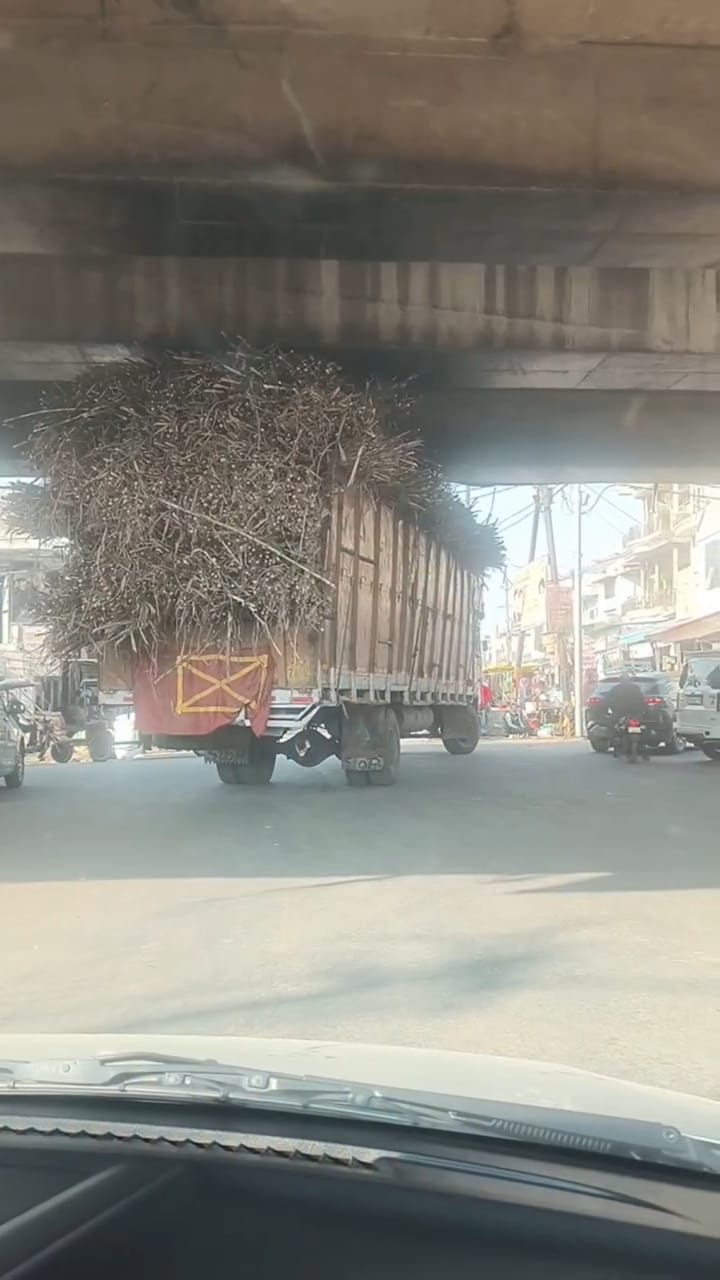 इस वीडियो में गन्ने से लदा एक ओवर लोडिड ट्रक कुचेसर रोड चौपला से गुजर रहा है और ओवर ब्रिज के नीचे निकलते वक्त बिज की छत से टकराते हुए चल रहा है।