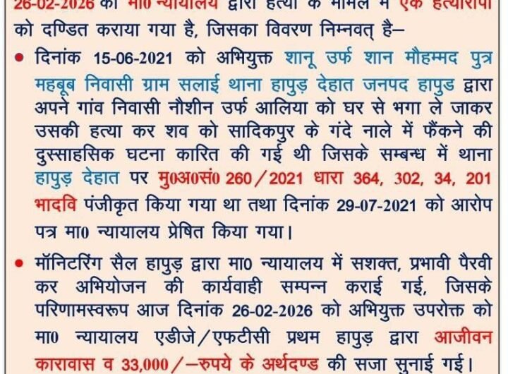लड़की को भगाकर ले गया,फिर की हत्या,शव नाले में फैंका,अब जेल में चक्की पीसना Featured Hapur City News || हापुड़ शहर न्यूज़ लड़की को भगाकर ले गया,फिर की हत्या,शव नाले में फैंका,अब जेल में चक्की पीसना Satya Prakash Seeman February 26, 2026 लड़की को भगाकर ले गया,फिर की हत्या,शव नाले में फैंका,अब जेल में चक्की पीसनाहापुड, सीमन (ehapurnews.com/):वर्ष-2021 में...Read More