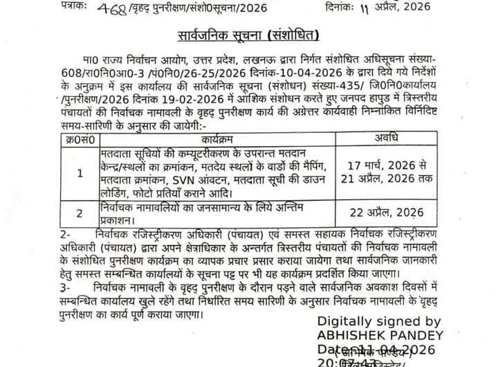 पंचायत चुनाव की अंतिम मतदाता सूची का प्रकाशन 22 अप्रैल को Featured Hapur City News || हापुड़ शहर न्यूज़ पंचायत चुनाव की अंतिम मतदाता सूची का प्रकाशन 22 अप्रैल को Satya Prakash Seeman April 13, 2026 पंचायत चुनाव की अंतिम मतदाता सूची का प्रकाशन 22 अप्रैल कोहापुड, सूवि(ehapurnews.com): राज्य निर्वाचन आयोग, उत्तर प्रदेश,...Read More