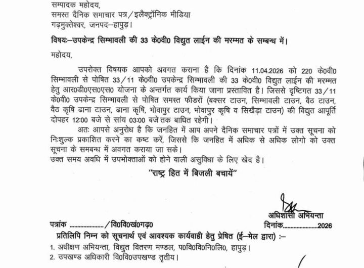 आज 3 घंटे प्रभावित रहेगी बक्सर, वैठ, भोवापुर टाउन आदि इलाकों की विद्युत आपूर्ति Featured Simbhaoli News । सिंभावली न्यूज़ आज 3 घंटे प्रभावित रहेगी बक्सर, वैठ, भोवापुर टाउन आदि इलाकों की विद्युत आपूर्ति Satya Prakash Seeman April 11, 2026 आज 3 घंटे प्रभावित रहेगी बक्सर, वैठ, भोवापुर टाउन आदि इलाकों की विद्युत आपूर्ति हापुड़, सीमन (ehapurnews.com):...Read More