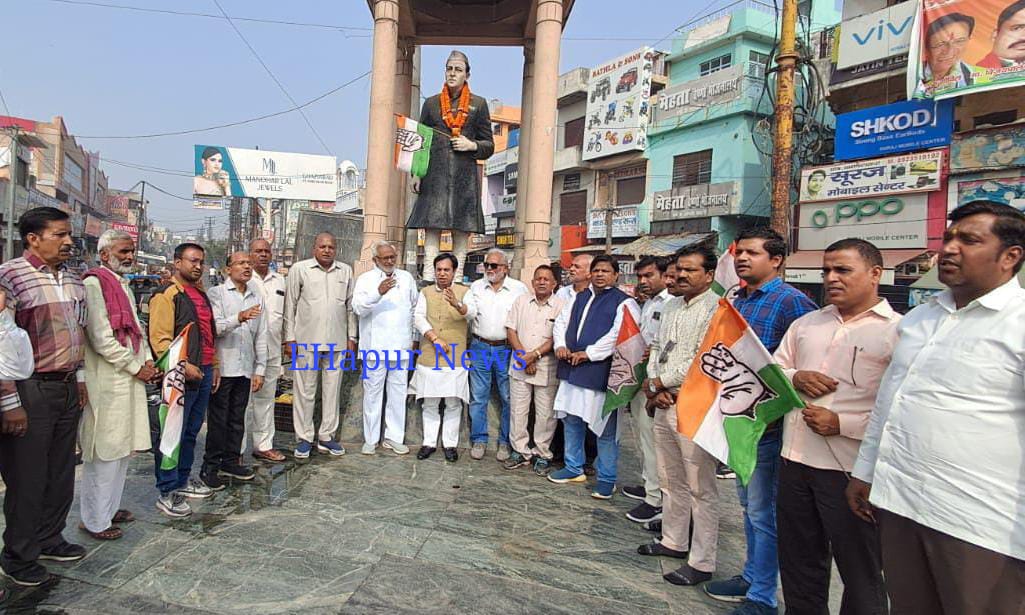 शहर कांग्रेस कमेटी हापुड़ के अध्यक्ष अभिषेक गोयल व भूतपूर्व विधायक गजराज सिंह के नेतृत्व में कांग्रेसजन, गौरव गर्ग, विक्की शर्मा, दिनेश शर्मा, सैय्यद अयाजुद्दीन, डा.शोएब, अमर नाथ प्रधान, भरत लाल शर्मा आदि हापुड़ के अतरपुरा चौपला पर स्थित पंडित नेहरु की प्रतिमा पर एकत्र हुए और कांग्रेसजनों ने प्रतिमा पर माल्यार्पण कर श्रद्धासुमन अर्पित कर उन्हें याद किया। हापुड़ के कांग्रेसजनों ने पंडित नेहरु को याद करने के बाद गरीबों को फल आदि वितरित किए। शहर अध्यक्ष अभिषेक गोयल ने कहा कि देश के विकास में पंडित नेहरु के योगदान को कभी भुलाया नहीं जा सकता। हापुड़ के कांग्रेसजनों ने कांग्रेस के सिद्धान्तों पर चलने तथा कांग्रेस की नीतियों का प्रचार-प्रसार करने के साथ-साथ संगठन को मजबूत करने का संकल्प लिया।