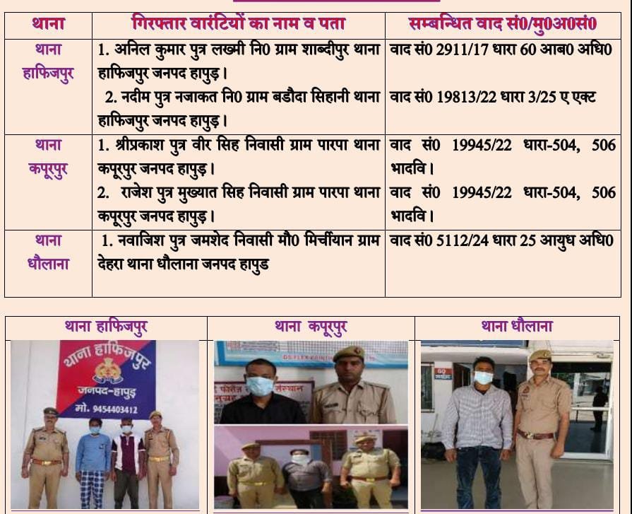 हापुड, सीमन (ehapurnews.com):हापुड़ पुलिस द्वारा जनपद में अपराध की रोकथाम एवं वारन्टी व वांछित अभियुक्तों की गिरफ्तारी हेतु चलाए जा रहे ऑपरेशन तलाश अभियान के अन्तर्गत थाना हाफिजपुर व थाना कपूरपुर पुलिस द्वारा 02-02 वारन्टियों एंव थाना धौलाना पुलिस द्वारा एक वारन्टी को गिरफ्तार कर लिया।वारंटी अदालत में तारीख पर हाजिर न हो रहे थे।