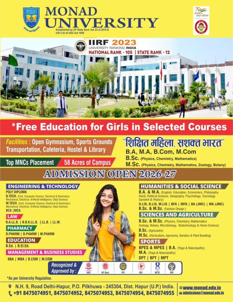 MONAD UNIVERSITY: ADMISSION OPEN 2026-2027 || Free Education for Girls in Selected Courses: 8475074951,52