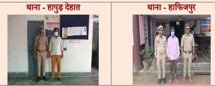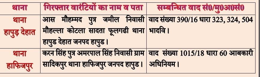 हापुड सीमन (ehapurnews.com):हापुड़ पुलिस द्वारा जनपद में अपराध की रोकथाम एवं वारन्टी व वांछित अभियुक्तों की गिरफ्तारी हेतु चलाए जा रहे ऑपरेशन तलाश अभियान के अन्तर्गत थाना हापुड़ देहात व हाफिजपुर पुलिस ने दो वारन्टियों को गिरफ्तार कर लिया।आरोपी न्यायालय में तारीख पर हाजिर न हो रहे थे।पुलिस ने वारंट के आधार पर गिरफ्तार कर लिया।
