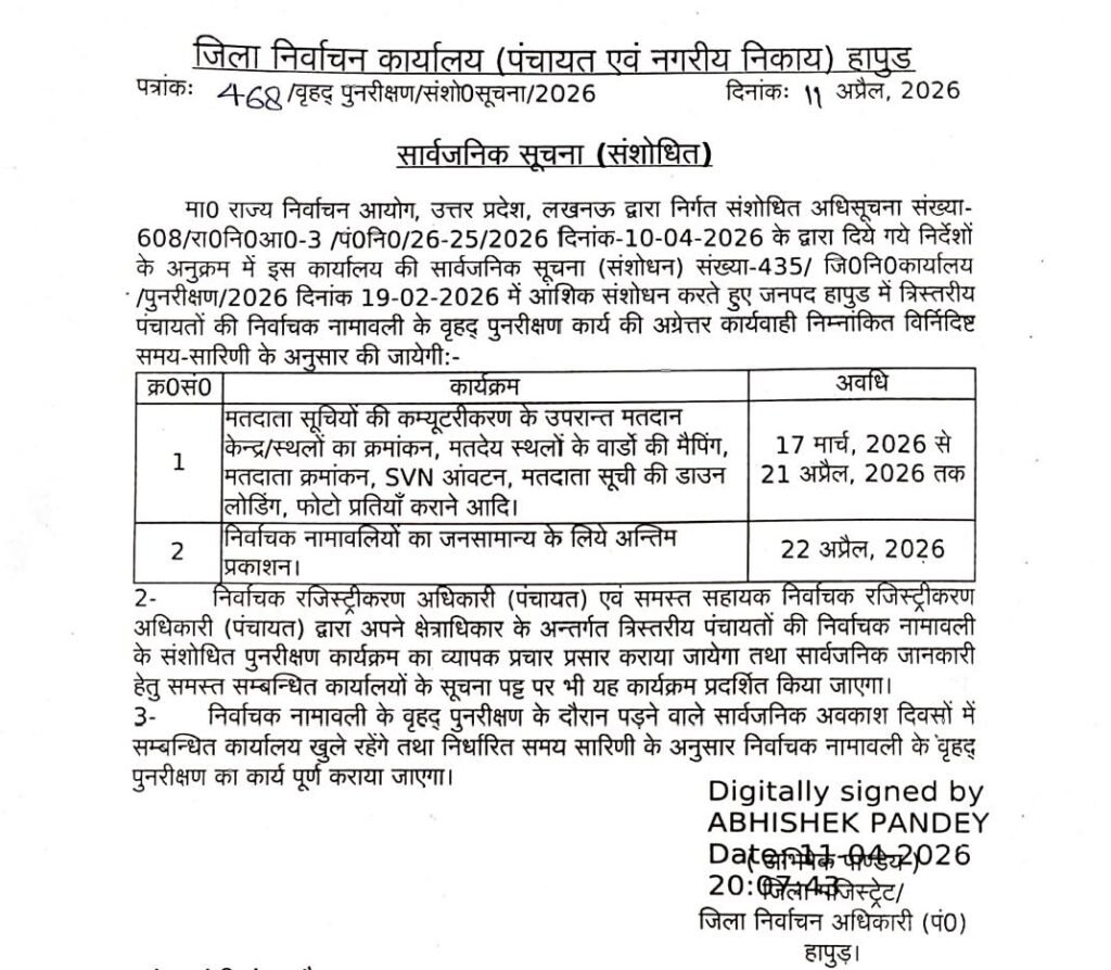 हापुड, सूवि(ehapurnews.com): राज्य निर्वाचन आयोग, उत्तर प्रदेश, लखनऊ द्वारा निर्गत संशोधित अधिसूचना द्वारा दिये गये निर्देशों के अनुक्रम में इस कार्यालय की सार्वजनिक सूचना (संशोधन) संख्या-435/ जि0नि0 कार्यालय / पुनरीक्षण/2026 दिनांक 19-02-2026 में आंशिक संशोधन करते हुए जनपद हापुड में त्रिस्तरीय पंचायतों की निर्वाचक नामावली के वृहद् पुनरीक्षण कार्य की अग्रेत्तर कार्यवाही निम्नांकित विर्निदिष्ट समय-सारिणी के अनुसार की जायेगी:-