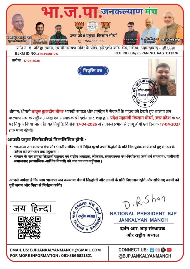 हापुड़, सीमन (ehapurnews.com): भारतीय जनता पार्टी जन कल्याण मंच ने ठाकुर कुलदीप तोमर को प्रदेश महामंत्री किसान मोर्चा उत्तर प्रदेश के पद पर नियुक्त किया है। 1 वर्ष की अवधि के लिए कुलदीप तोमर को यह जिम्मेदारी सौंपी गई है। संगठन के राष्ट्रीय अध्यक्ष D.R. शाह ने यह जिम्मेदारी सौंपी है।
