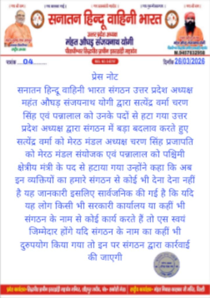 हापुड़, सीमन / अशोक तोमर (ehapurnews.com): सनातन हिन्दू वाहिनी भारत संगठन उत्तर प्रदेश अध्यक्ष महंत औघड़ संजयनाथ योगी द्वारा सत्येंद्र वर्मा चरण सिंह एवं पन्नालाल को उनके पदों से मुक्त किया गया। उत्तर प्रदेश अध्यक्ष द्वारा संगठन में बड़ा बदलाव करते हुए सत्येंद्र वर्मा को मेरठ मंडल अध्यक्ष चरण सिंह प्रजापति को मेरठ मंडल संयोजक एवं पन्नालाल को पश्चिमी क्षेत्रीय मंत्री के पद से हटा दिया है। इस संबंध में पत्र भी जारी हुआ है।
