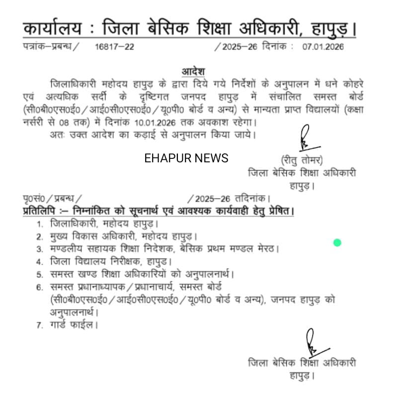 हापुड़, सीमन/संजय कश्यप (ehapurnews.com): कड़ाके की सर्दी को देखते हुए जनपद हापुड़ की जिला बेसिक शिक्षा अधिकारी ऋतु तोमर ने जनपद हापुड़ में संचालित समस्त बोर्ड सीबीएसई/ आईसीएसई/ यूपी बोर्ड आदि से मान्यता प्राप्त विद्यालयों में कक्षा नर्सरी से 8 तक के विद्यालय को 10 जनवरी तक बंद रखने के आदेश दिए हैं। 11 जनवरी का रविवार है ऐसे में 12 जनवरी से विद्यालय खुलेंगे।