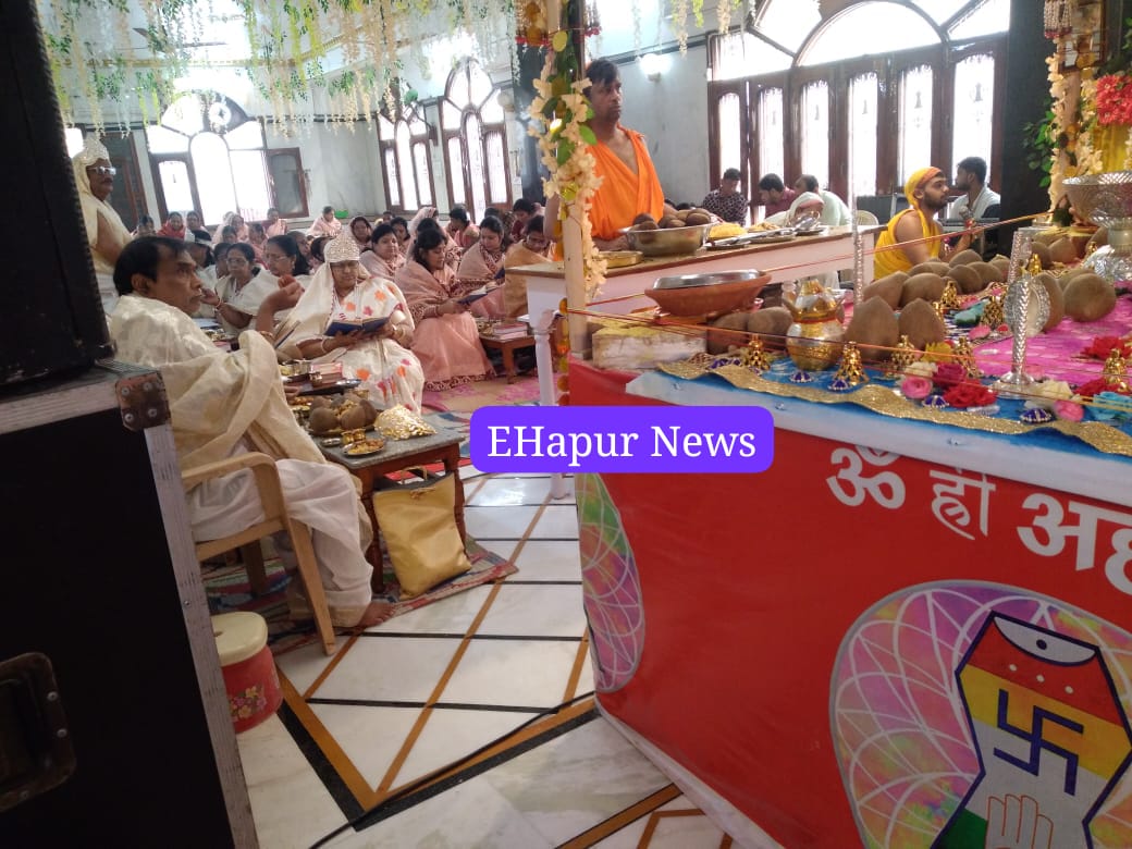 हापुड, सीमन/सुरेश जैन (Ehapurnews.com): श्री 1008 आदिनाथ दिगम्बर जैन मंदिर कसेरठ बाजार पर श्री 108 आचार्य नमोस्तु सागर जी महाराज के सानिध्य मे दस दिवसीय सिद्ध चक्र विधान पाठ की पूजा जारी है। सैकड़ो जैन साधक-साधिकाओ ने सोमवार प्रातःकाल विधान पाठ मे बैठकर श्रद्धांपूर्वक पूजा की। बाल ब्रह्मचारिणी रचना दीदी ने विधान पाठ के मंत्रो का उच्चारण कराया। सगीतज्ञ विकास भारद्वाज ने संगीत दिया। विधान पाठ से पूर्व शान्ति धारा अभिषेक किया गया। आचार्य नमोस्तु सागर जी महाराज ने कहा कि सिद्ध चक्र विधान पाठ सभी विधान पाठो मे श्रेष्ठ है इसमे 10 दिन बैठकर शुद्ध भावो से पूजन करने पर सभी मनोकामनाएं पूर्ण होती हैं।