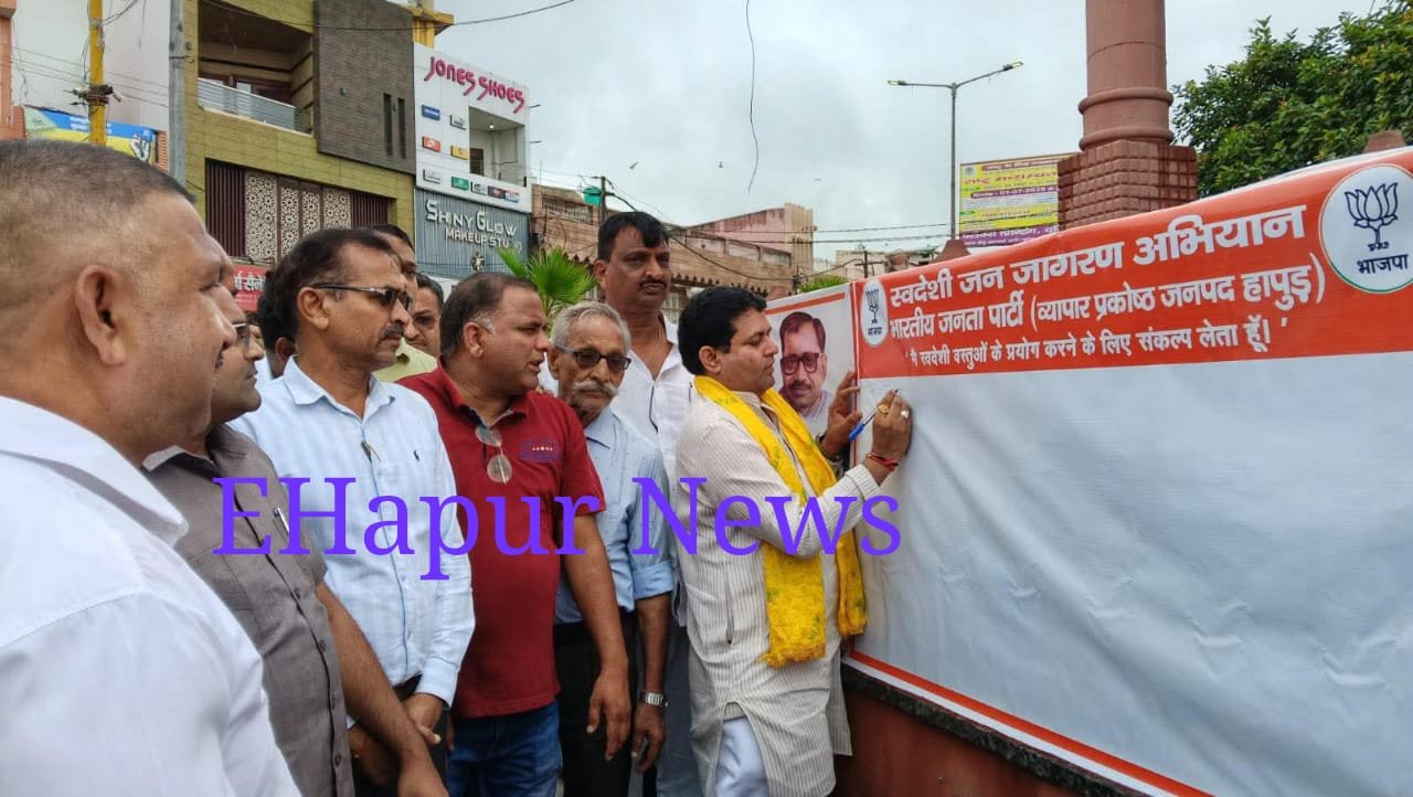 स्वदेशी अपनाओ के समर्थन में हस्ताक्षर अभियान हापुड, सीमन(ehapurnews.com):भारतीय जनता पार्टी व्यापार प्रकोष्ठ जनपद हापुड़ के तत्वावधान में आयोजित स्वदेशी जन जागरण अभियान के समर्थन में आयोजित हस्ताक्षर अभियान का शुभारंभ भारतीय जनता पार्टी के जिला अध्यक्ष नरेश तोमर ने सोमवार को हापुड में किया।यह अभियान एक पखवाड़ा तक चलेगा।हापुड के अतरपुरा चौपला पर स्थित डा श्यामा प्रसाद मुखर्जी की प्रतिमा पर सोमवार को भाजपाई एकत्र हुए। भाजपा के जिलाध्यक्ष नरेश तोमर ने बैनर पर हस्ताक्षर अभियान का श्री गणेश किया और लोगो से आव्हान किया कि वे स्वदेशी उत्पाद को बढावा देने के लिए स्वदेशी अपनाए।अनेक राहगीरों ने भी अभियान के समर्थन में बैनर पर हस्ताक्षर किए। इस अवसर पर प्रकोष्ठ के क्षेत्रीय संयोजक विनोद गुप्ता, जिला संयोजक अशोक बबली, जिला सहसंयोजक दीपांशु गर्ग, नगर संयोजक अंकुर कंसल लोहे वाले, नगर संयोजक योगेंद्र मोनू, नगर उपाध्यक्ष मनोज तोमर,नगर मंत्री मुदित गोयल , संजय बाल्मीकि, पूर्व जिला महामंत्री प्रमोद जिंदल, नगर सह सयोजक संजय शर्मा, नगर सह सयोजक शरद गर्ग, हेमंत सैनी और सभासद आदित्य सूद , सभासद नितिन पाराशर, सभासद रोहताश यादव, सभासद संजीव चौटाला , सभासद शशांक गुप्ता , सतीश सिंघाल, अंकुर भाई कसेरे , मधुर कंसल , उदय कंसल, जिला सहसंयोजक दीपांशु गर्गआदि कार्यकर्ता उपस्थित रहे।