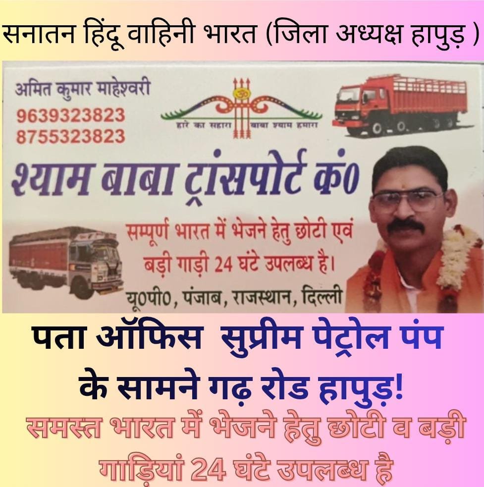 Featured Hapur City News || हापुड़ शहर न्यूज़ समस्त भारत में भेजने हेतु छोटी व बड़ी गाड़ियां 24 घंटे उपलब्ध: श्याम बाबा ट्रांसपोर्ट कंपनी: 9639323823, 8755323823 Satya Prakash Seeman April 1, 2026 🔊 Listen to this 👁 21 views ViewsShare this… Facebook Messenger Twitter Gmail Linkedin WhatsappShare this… Facebook Messenger Twitter Gmail Linkedin Whatsapp📢 Join Our WhatsApp Groupहापुड़ की ताजा खबरों के लिए हमारे व्हाट्सएप ग्रुप से जुड़े Join Now