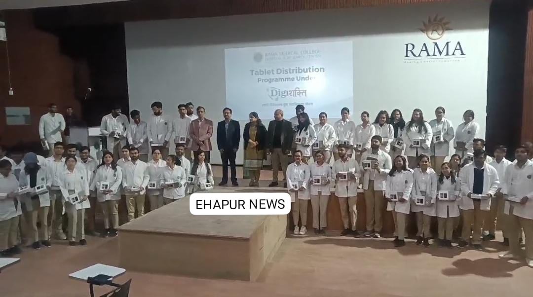 हापुड़, सीमन/रियाज़ अहमद (ehapurnews.com): उत्तर प्रदेश सरकार के तत्वाधान में Digiशक्ति स्वामी विवेकानन्द युवा सशक्तिकरण योजना के अन्तर्गत रामा मेडिकल कालेज हास्पिटल एण्ड रिसर्च सेन्टर, पिलखुवा, हापुड़ के एम०बी०बी०एस० कोर्स, बैच 2020 में अध्ययनरत छात्र/छात्राओ को शनिवार को संस्थान के सभागार में आयोजित कार्यक्रम में रामा संस्थान के विभागाध्यक्षों द्वारा टैबलेट वितरित किये गये। कार्यक्रम में डा० विनोद चैतन्य, विभागाध्यक्ष मेडिसिन, डा० ज्ञानेन्द्र मित्तल, विभागाध्यक्ष सर्जरी, डा० आर० नारायन, विभागाध्यक्ष पिडियाट्रिक्स, डा० सुनीता गुलाटी, विभागाध्यक्ष औब्स एण्ड गाइनी, विक्रान्त सिंह तोमर, महाप्रबन्धक (संचालन) और विक्रान्त सक्सेना, सहायक महाप्रबन्धक (एच०आर०) उपस्थित रहे।