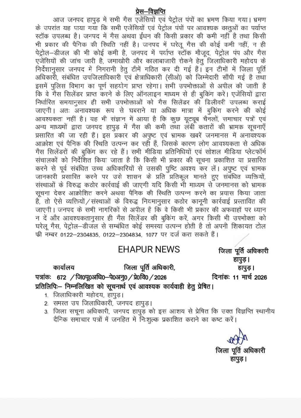 हापुड़, सीमन (ehapurnews.com): पेट्रोल-डीजल व गैस की जमाखोरी और कालाबाजारी रोकने के लिए जनपद हापुड़ में जिलाधिकारी के निर्देश पर निगरानी के लिए टीमें गठित की गई हैं। जिला पूर्ति अधिकारी हापुड़ ने प्रेस नोट जारी कर बताया कि जनपद हापुड़ में पेट्रोल पंप पर पेट्रोल-डीजल और एजेंसियों पर गैस का पर्याप्त स्टॉक उपलब्ध है। किसी भी प्रकार की पैनिक की स्थिति नहीं है और ना ही घरेलू गैस और पेट्रोल-डीजल की कोई कमी है। कालाबाजारी रोकने के लिए टीमें गठित की गई हैं जिसमें जिला पूर्ति अधिकारी, संबंधित उपजिलाधिकारी और क्षेत्राधिकारी को जिम्मेदारी सौंपी गई है। विभाग ने सभी उपभोक्ताओं से अपील की है कि गैस सिलेंडर प्राप्त करने के लिए ऑनलाइन माध्यम से ही बुकिंग करें। निर्धारित समय पर उपभोक्ताओं को गैस सिलेंडर की डिलीवरी उपलब्ध कराई जाएगी। घबराने या अधिक मात्रा में बुकिंग करने की भी कोई जरूरत नहीं है। विभाग ने अपील की है अफवाहों पर ध्यान ना दें।