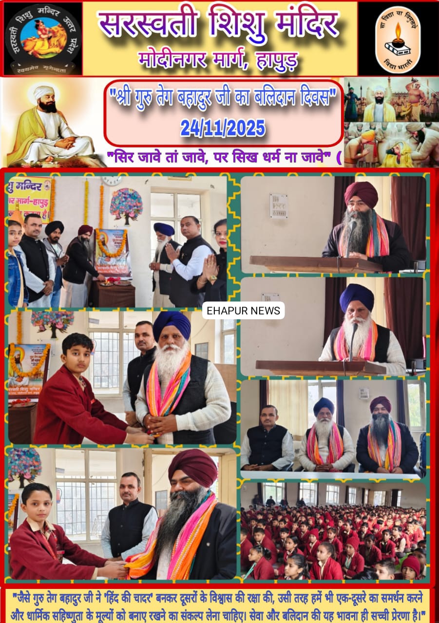 सोमवार को सरस्वती शिशु मंदिर मोदीनगर मार्ग, हापुड़ में सिखों के नौवे गुरु साहिब श्री गुरु तेग बहादुर जी का 350 वां बलिदान दिवस अत्यंत श्रद्धा और सम्मान के साथ मनाया गया।