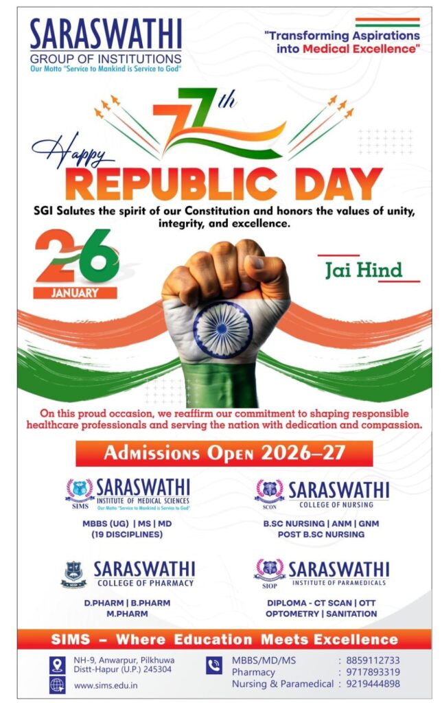 हापुड़, सीमन /रियाज़ अहमद (ehapurnews.com): हापुड़ के पिलखुवा में स्थित सरस्वती ग्रुप ऑफ इंस्टीट्यूशंस परिसर में भारत का 77वां गणतंत्र दिवस अत्यंत उत्साह, राष्ट्रीय गौरव एवं देशभक्ति की भावना के साथ मनाया गया। यह आयोजन संविधानिक मूल्यों, एकता और जिम्मेदार नागरिकता के प्रति संस्थान की दृढ़ प्रतिबद्धता को दर्शाता है।