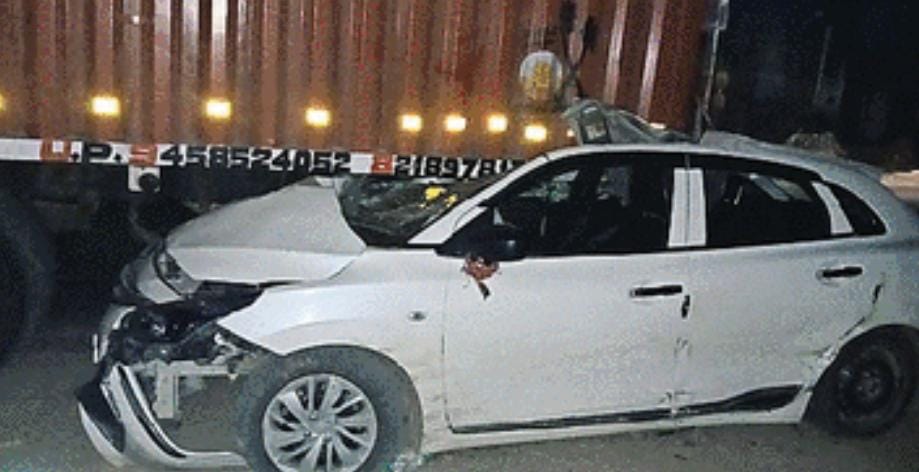ट्रक में घुसी गाड़ी हुई क्षतिग्रस्त, चालक घायल