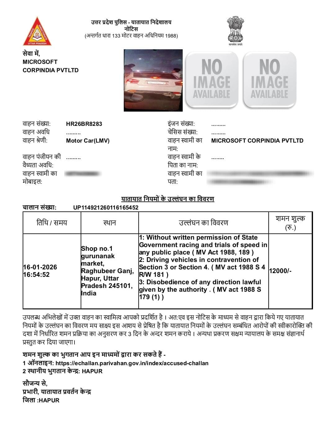 हापुड, सीमन (ehapurnews.com):जनपद हापुड़ में कार सवार कुछ युवकों द्वारा कार की खिड़की से बाहर निकलकर हुड़दंग,स्टंट करने संबंधित फोटो व वीडियो सोशल मीडिया पर वायरल हुआ, जिसका यातायात पुलिस द्वारा तत्काल संज्ञान लेते हुए उक्त कार का 12,000/- रुपये का चालान किया गया।