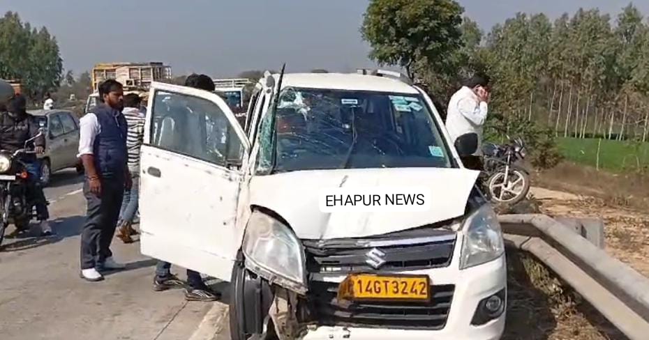 हापुड़, सीमन (ehapurnews.com): हापुड़ की ततारपुर चौकी से कुछ मीटर पहले एक सफेद रंग की वेगनआर गाड़ी अनियंत्रित होकर हाईवे पर पलट गई। बताया जा रहा है कि सफेद रंग गाड़ी ने 5 से 6 पलटी खाई। कार में सवार दोनों लोग हादसे के दौरान मामूली रूप से घायल हो गए जिन्हें राहगीरों ने बाहर निकाला और पुलिस को मामले से अवगत कराया। इसके बाद दोनों को अस्पताल में भर्ती कराया। इस दौरान गाड़ी भी क्षतिग्रस्त हो गई। गनीमत रही कि किसी को ज्यादा चोट नहीं आई।