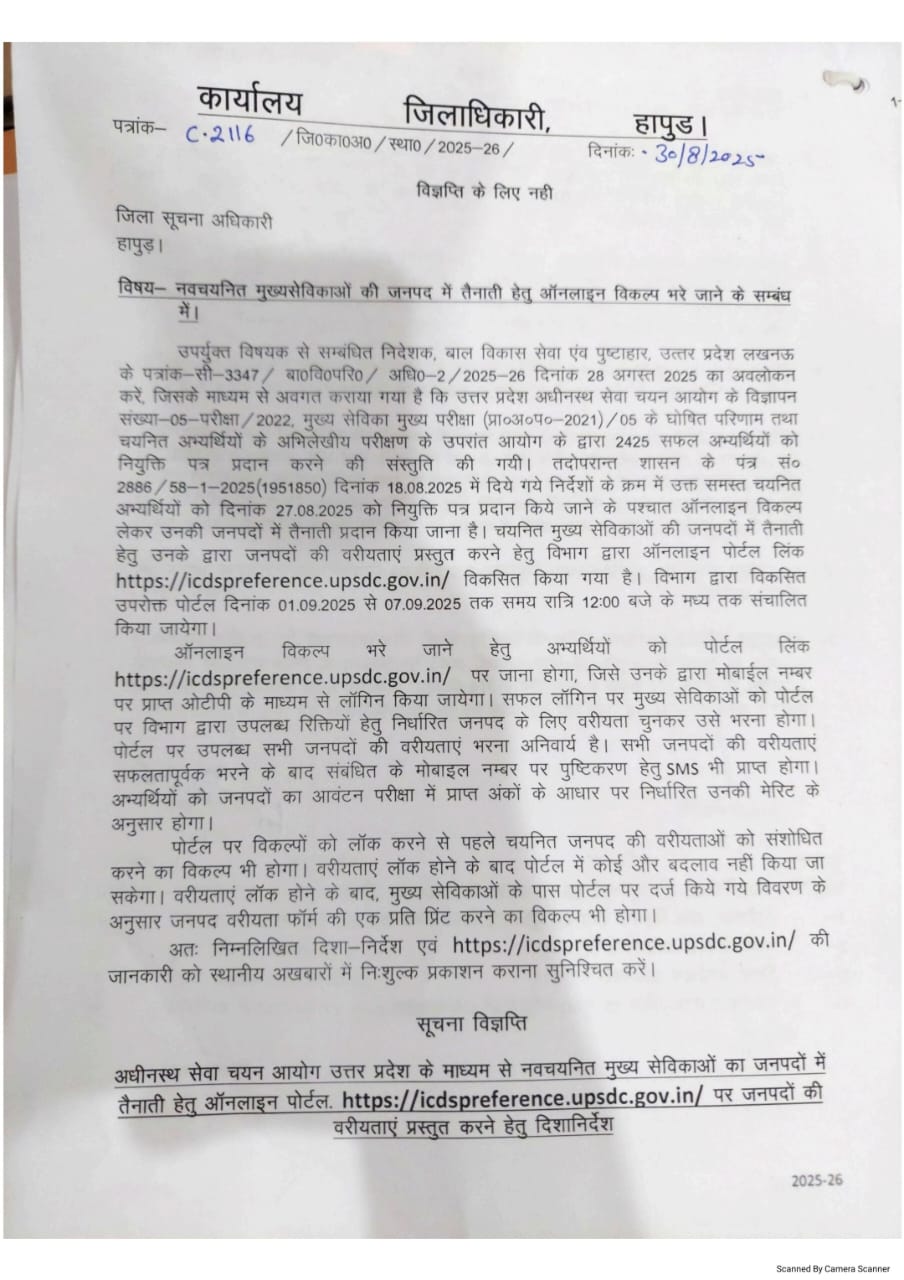 हापुड़,सूवि(ehapurnews.com):बाल विकास सेवा एवं पुष्टाहार विभाग में नवनियुक्त मुख्य सेविकाओं की नियुक्ति के लिए शासन ने ऑनलाइन विकल्प मांगे ताकि उनकी मनचाही नियुक्ति हो सके। ऑनलाइन विकल्प लेकर उनकी जनपदों में तैनाती प्रदान किया जाना है। चयनित मुख्य सेविकाओं की जनपदों में तैनाती हेतु उनके द्वारा जनपदो की वरीयताएं प्रस्तुत करने हेतु विभाग द्वारा ऑनलाइन पोर्टल लिंक https://icdspreference.upsdc.gov.in/ विकसित किया गया है। विभाग द्वारा विकसित उपरोक्त पोर्टल दिनांक 01.09.2025 से 07.09.2025 तक समय रात्रि 12 बजे के मध्य तक संचालित किया जायेगा। पोर्टल लिंक ऑनलाइन भरे जाने हेतु अभ्यर्थियों को विकल्प https://icdsprefer-ence.upsdc.gov.in पर जाना होगा, जिसे उनके द्वारा मोबाईल नम्बर पर प्राप्त ओटीपी के माध्यम से लॉगिन किया जायेगा। सफल लॉगिन पर मुख्य सेविकाओं को पोर्टल पर विभाग द्वारा उपलब्ध रिक्तियों हेतु निर्धारित जनपद के लिए वरीयता चुनकर उसे भरना होगा। पोर्टल पर उपलब्ध सभी जनपदों की वरीयताएं भरना अनिवार्य है। सभी जनपदों की वरीयताएं सफलतापूर्वक भरने के बाद संबंधित के मोबाइल नम्बर पर पुष्टिकरण हेतु SMS भी प्राप्त होगा। अभ्यर्थियों को जनपदों का आवंटन परीक्षा में प्राप्त अंकों के आधार पर निर्धारित उनकी मेरिट के अनुसार होगा।