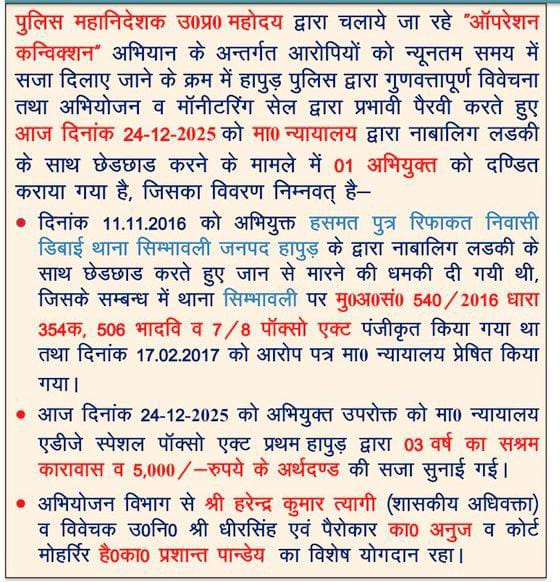 हापुड, सीमन (ehapurnews.com):उ0प्र0 सरकार द्वारा चलाए जा रहे “मिशन शक्ति फेज-5.0” अभियान में चिन्हित महिला सम्बन्धी अपराधों में आरोपियों को न्यूनतम समय में सजा दिलाये जाने के क्रम में हापुड़ पुलिस द्वारा न्यायालय में प्रभावी पैरवी करते हुए नाबालिग से छेड़छाड़ करने के मामले में एक आरोपी को 03 वर्ष का सश्रम कारावास व 5,000/- रुपये के अर्थदण्ड से दण्डित कराया गया। अभियुक्त थाना सिम्भावली के गांव डिबाई का हसमत है।अभियुक्त को जेल भेज दिया है।