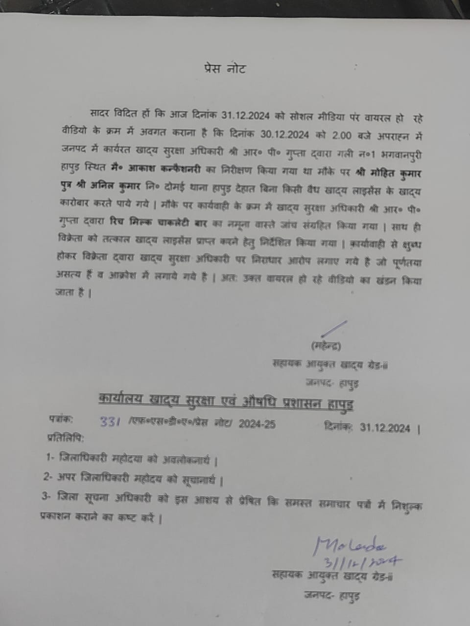 हापुड़, सीमन (ehapurnews.com): हापुड़ भगवानपुरी स्थित आकाश कन्फेक्शनरी के संचालक ने खाद्य विभाग पर रिश्वत मांगने का आरोप लगाया था। इसके बाद सहायक आयुक्त खाद्य महेंद्र कुमार द्वारा जारी प्रेस नोट में बताया गया है कि आकाश कन्फेक्शनरी का निरीक्षण करने के लिए जब 30 दिसंबर को खाद्य सुरक्षा अधिकारी आरपी गुप्ता पहुंचे तो पाया गया कि दुकान का संचालन बिना वैद्य लाइसेंस के किया जा रहा है। इसके बाद खाद्य सुरक्षा अधिकारी आरपी गुप्ता ने रिच मिल्क चॉकलेट बार का नमूना लेकर जांच के लिए भेजा। इसी के साथ दुकानदार द्वारा लगाए गए सभी आरोपों को विभाग ने निराधार बताया जिनका खाद्य विभाग ने खंडन किया है।
