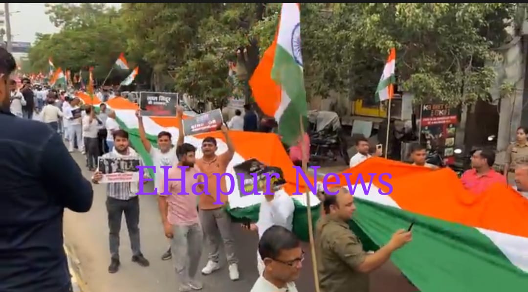 हापुड़, सीमन (ehapurnews.com): आपरेशन सिंदूर के बाद शुक्रवार की शाम को हापुड़ में निकाली गई तिरंगा यात्रा के दौरान वंदे मातरम्, भारत माता कीजय के उद्घोष से हापुड़ गूंज उठा। इस तिरंगा यात्रा में जनपद हापुड़ के शहरी व ग्रामीण इलाकों से बड़ी तादाद में आपसी मतभेद भूल कर लोग शामिल हुए और देश भक्ति का परिचय दिया। तिरंगा यात्रा में शामिल महिलाएं व पुरुष हाथों में तिरंगा झंडा व तख्तियां लिए थे। तख्तियों पर पाक विरोधी नारे लिखे थे। तिरंगा यात्रा को प्रदेश मंत्री नरेंद्र कश्यप ने हरी झंडी दिखाई।