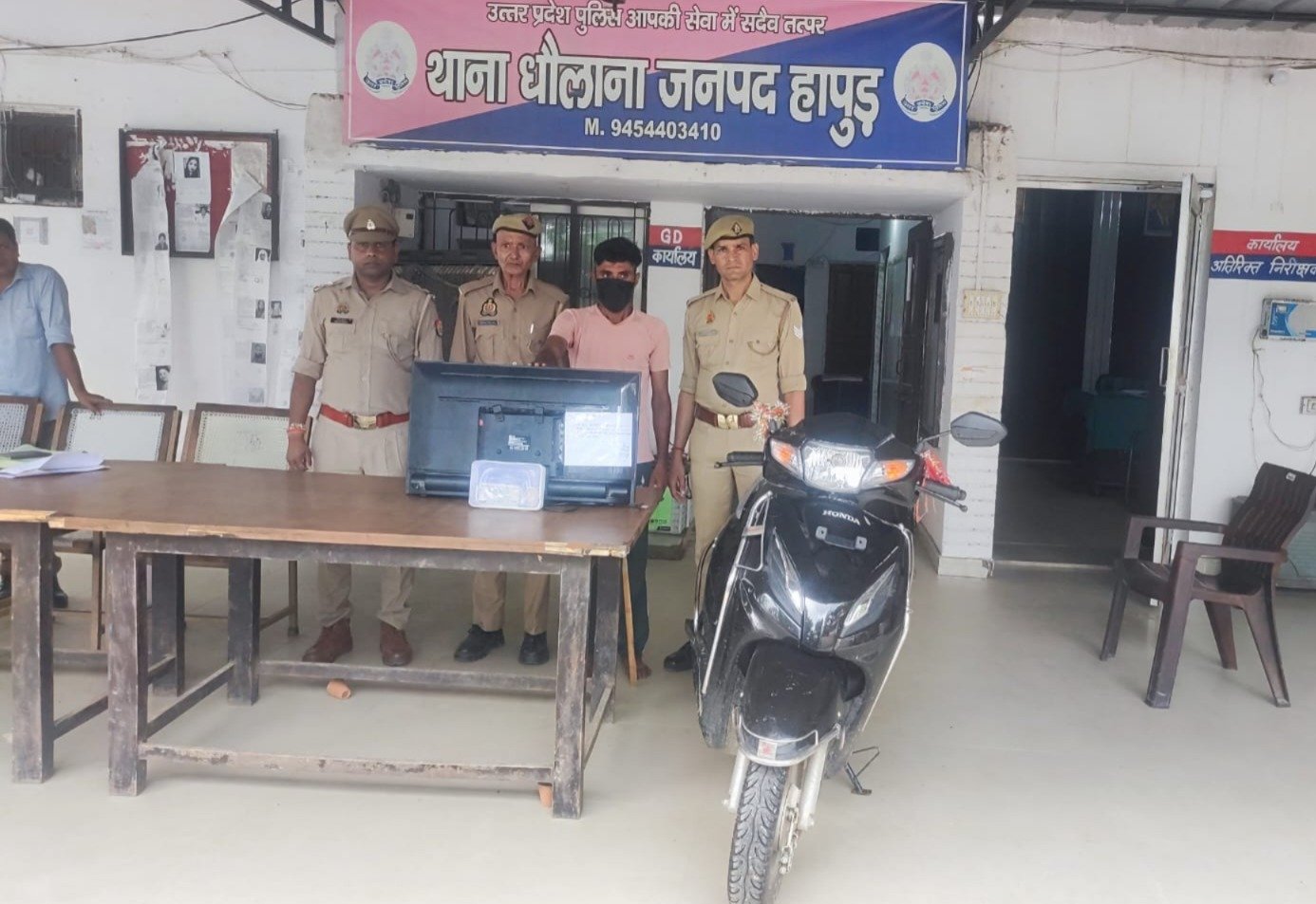 हापुड, सीमन (ehapurnews.com):हापुड जनपद के थाना धौलाना पुलिस ने थाना क्षेत्रार्तंगत शराब की दुकान में हुई चोरी की घटना का खुलासा करते हुए एक बाल अपचारी सहित दो शातिर बदमाशो को गिरफ्तार कर लिया।पुलिस ने पकड़े गए बदमाशो के कब्जे से 44,000/- रुपये नकद, एक एलसीडी एवं चोरी की वारदात में प्रयुक्त एक स्कूटी बरामद की है।