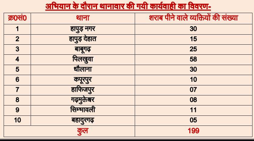 पुलिस के अनुसार हापुड़ पुलिस द्वारा सार्वजनिक स्थान पर मद्यपान तथा शराब पीने वाले व्यक्तियों के विरुद्ध चलाये जा रहे अभियान के अर्न्तगत 199 व्यक्तियों के विरूद्ध प्रभावी कार्यवाही की गई है।