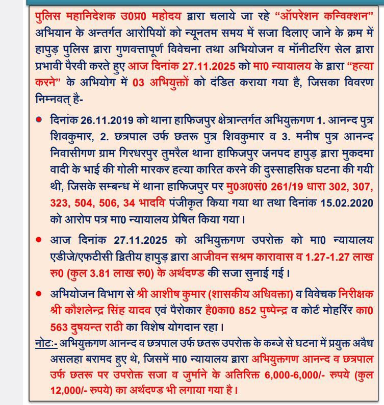 हापुड, सीमन (ehapurnews.com): ऑपरेशन कन्विक्शन अभियान के अन्तर्गत आरोपियों को न्यूनतम समय में सजा दिलाए जाने के क्रम में हापुड़ पुलिस द्वारा मा0 न्यायालय में प्रभावी, सशक्त पैरवी करते हुए हत्या करने के मामले में तीन अभियुक्तों को आजीवन सश्रम कारावास व 1.27-1.27 लाख रु0 (कुल 3.81 लाख रु0) के अर्थदण्ड से दंडित कराया गया।तीनो अभियुक्त एक ही परिवार के है,जिन्होंने गांव गिरधर तुमरैल में एक व्यक्ति की गोली मारकर हत्या कर दी थी।