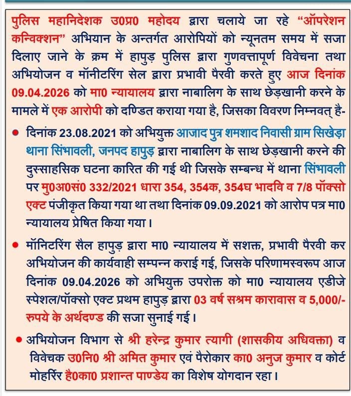 हापुड, सीमन(ehapurnews.com):मिशन शक्ति 5.0 फेज-02 अभियान में चिन्हित महिला सम्बन्धी अपराधों में आरोपियों को न्यूनतम समय में सजा दिलाये जाने के क्रम में हापुड़ पुलिस द्वारा मा0 न्यायालय में प्रभावी पैरवी करते हुए नाबालिग से छेड़खानी करने के मामले में एक आरोपी को 03 वर्ष का सश्रम कारावास व 5,000/- रुपये के अर्थदण्ड से दण्डित कराया गया है।अभियुक्त थाना सिम्भावली के गांव सिखैडा का आजाद पुत्र शमशाद है।अभियुक्त को जेल भेज दिया है।