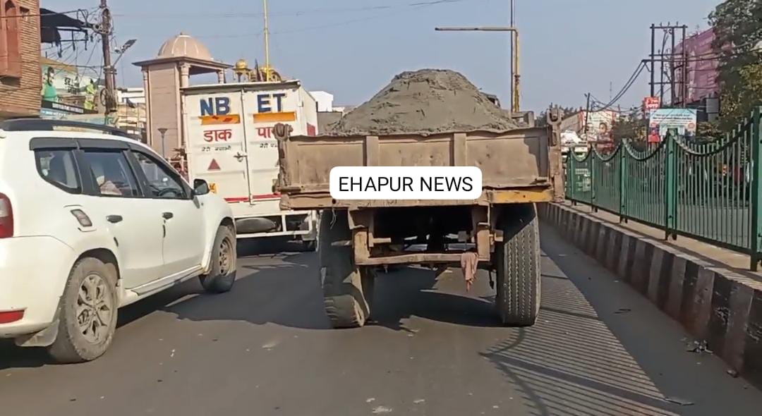 खुले में निर्माण सामग्री ले जा रही बिना नंबर प्लेट की ट्रैक्टर ट्रॉलियां