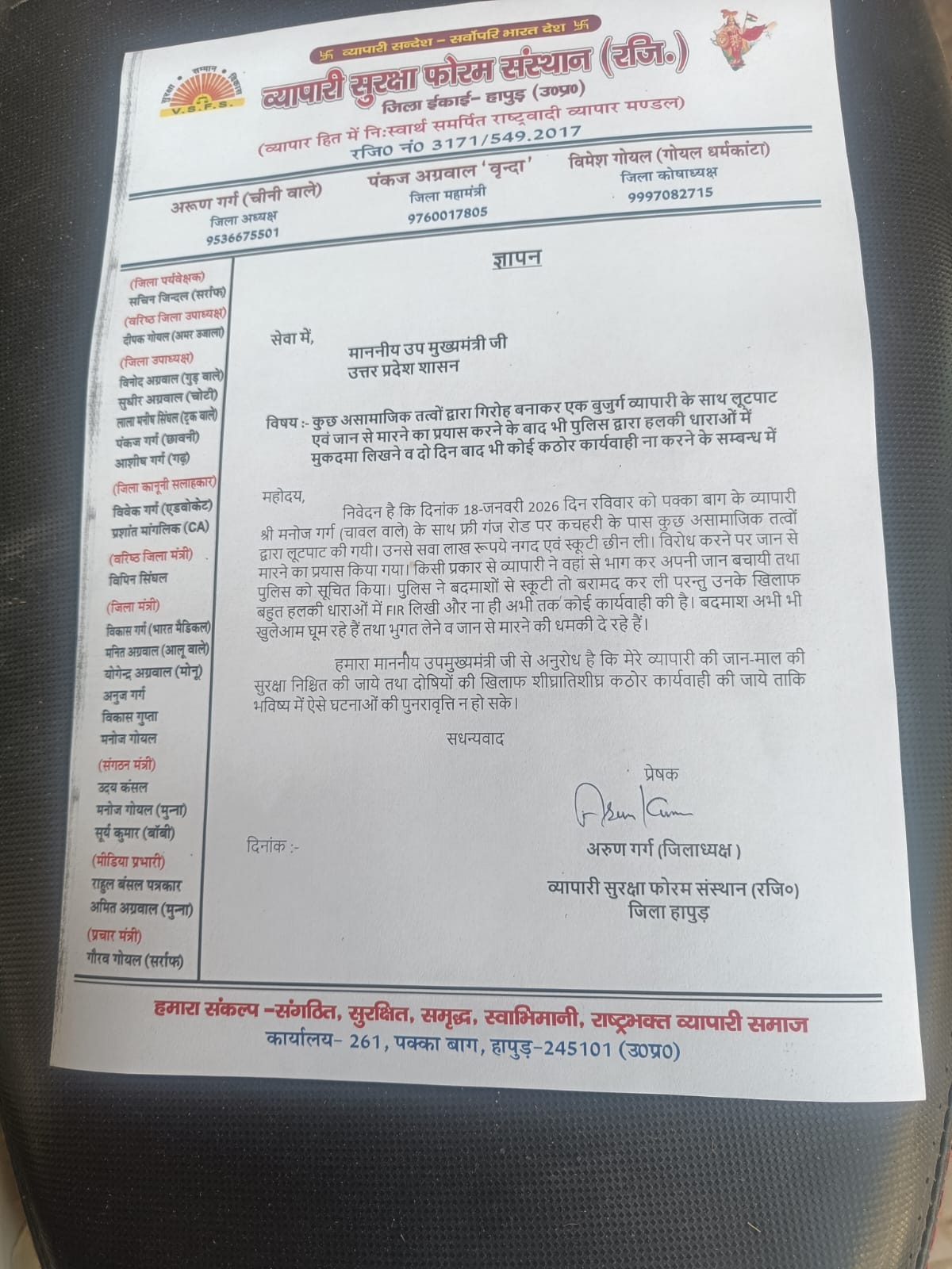 व्यापारी सुरक्षा फोरम संस्थान के जिलाध्यक्ष अरूण गर्ग ने बताया कि 18 जनवरी 2026 दिन रविवार को पक्का बाग के व्यापारी मनोज गर्ग (चावल वाले) के साथ फ्री गंज रोड पर कचहरी के पास कुछ असामाजिक तत्वों द्वारा लूटपाट की गयी। उनसे सवा लाख रूपये नगद एवं स्कूटी छीन ली। विरोध करने पर जान से मारने का प्रयास किया गया। किसी प्रकार से व्यापारी ने वहां से भाग कर अपनी जान बचायी तथा पुलिस को सूचित किया। पुलिस ने बदमाशों से स्कूटी तो बरामद कर ली परन्तु उनके खिलाफ बहुत हलकी धाराओं में FIR लिखी और ना ही अभी तक कोई कार्यवाही की है। बदमाश अभी भी खुलेआम घूम रहे हैं तथा भुगत लेने व जान से मारने की धमकी दे रहे हैं।
