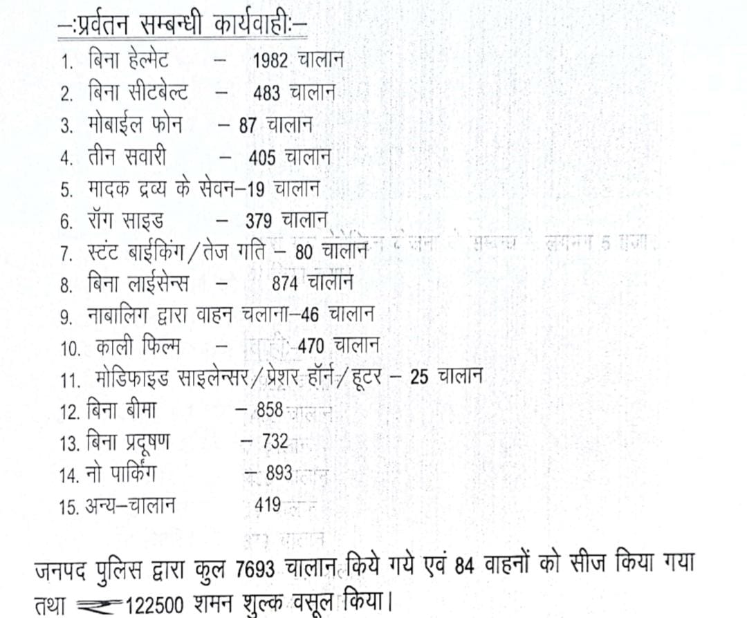 यातायात माह नवम्बर-2025 के अंतर्गत यातायात पुलिस व नागरिक पुलिस द्वारा संयुक्त रूप से कार्रवाई करते हुए 7693 वाहनो के चालान, 84 वाहन सीज किए गये।यातायात नियमो का उल्लंघन करने पर एक लाख 22 हजार पांच सौ रुपए का शमन शुल्क वसूला गया।