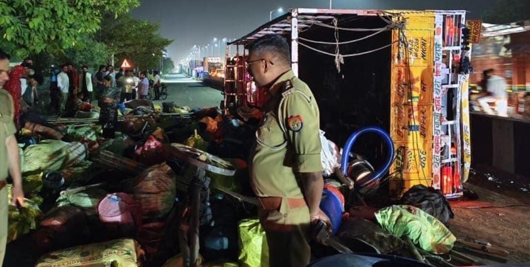 डिवाइडर से टकराकर अनियंत्रित हुआ ट्रक हाईवे पर पलटा, 13 घायल