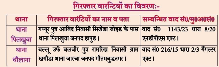हापुड, सीमन (ehapurnews.com):हापुड़ पुलिस द्वारा जनपद में अपराध की रोकथाम एवं वारन्टी व वांछित अभियुक्तों की गिरफ्तारी हेतु चलाए जा रहे ऑपरेशन तलाश अभियान के अन्तर्गत थाना पिलखुवा व धौलाना पुलिस ने कुल दो वारन्टियों को गिरफ्तार कर लिया।