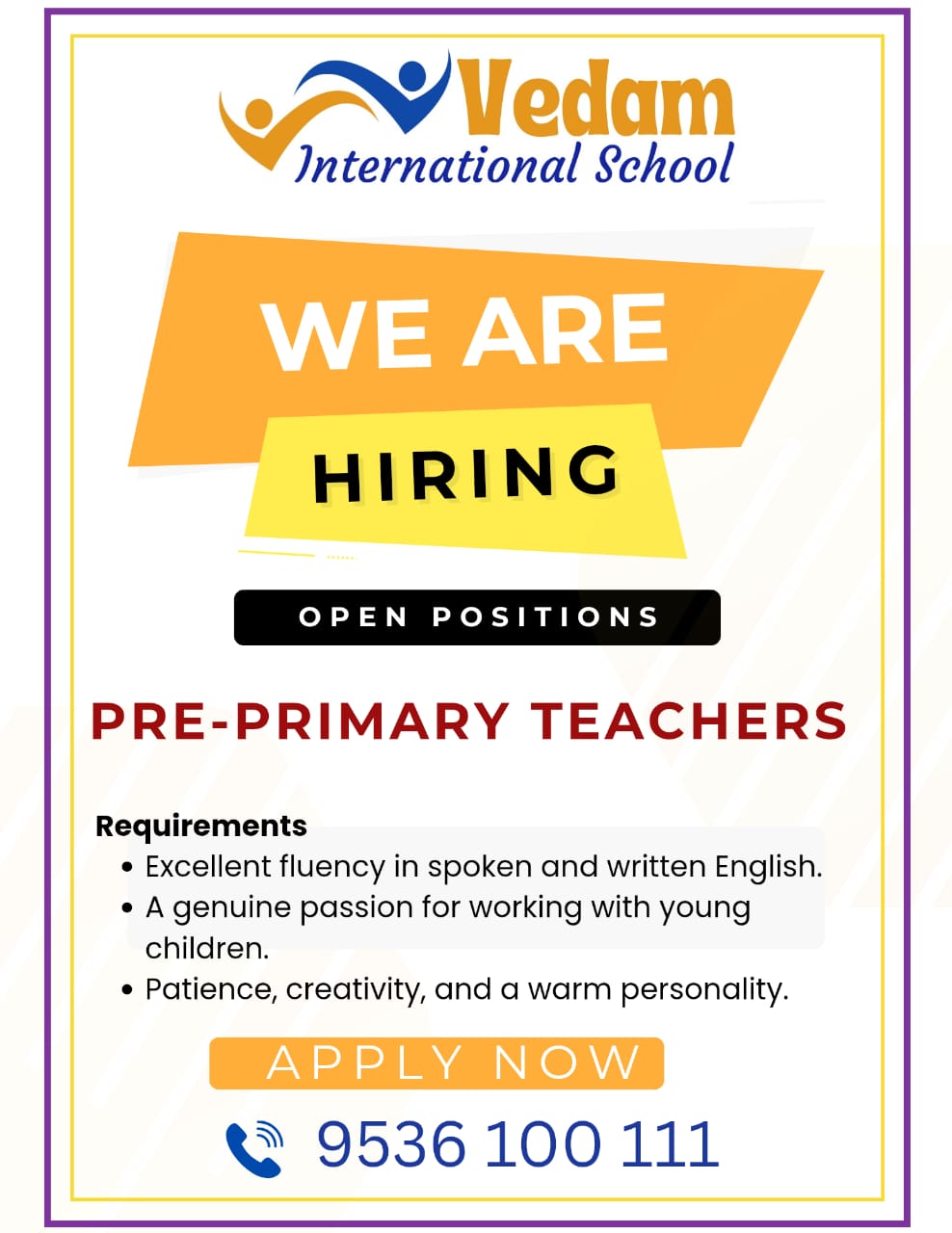 हापुड़, सीमन (ehapurnews.com): हापुड़ के जाने-माने स्कूल वेदम इंटरनेशनल स्कूल को जरूरत है प्री-प्राइमरी टीचर्स की जो इंग्लिश लिखने और बोलने में सक्षम हो। अधिक जानकारी के लिए संपर्क करें 9536100111 पर.