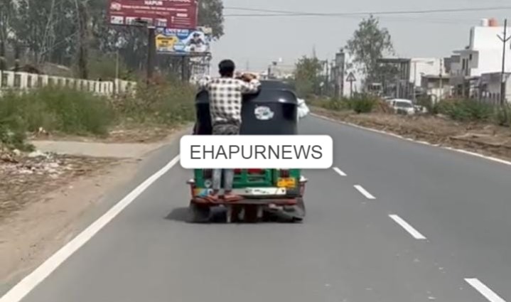 सोमवार को हापुड़ में एक वीडियो सोशल मीडिया पर वायरल हुई। वीडियो में देखा जा सकता है कि ऑटो के पीछे लटक कर एक युवक यात्रा कर रहा है। यात्रा करने वाला अपनी जान जोखिम में डाल रहा है। ऐसे में वीडियो वायरल होने के बाद यातायात व्यवस्था पर कई सवाल खड़े हो रहे हैं।