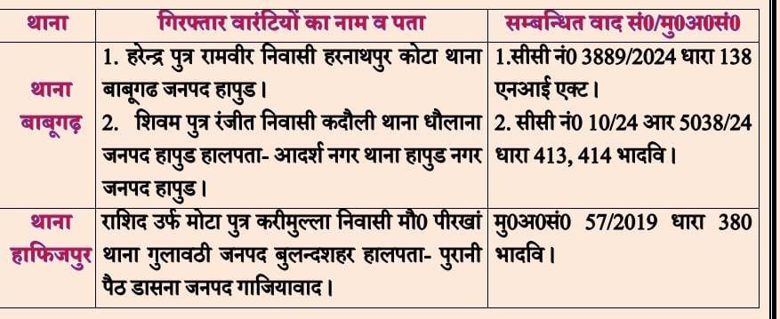 हापुड सीमन (ehapurnews.com):हापुड पुलिस द्वारा जनपद में अपराध की रोकथाम एवं वारंटी व वांछित अभियुक्तों की गिरफ्तारी हेतु चलाए जा रहे अभियान के अन्तर्गत थाना बाबूगढ़ व हाफिजपुर पुलिस ने तीन वारन्टियों को गिरफ्तार कर लिया। वारंटी अपने-अपने मुकददमे में न्यायालय में तारीख पर हाजिर नही हो रहे थे,जिस कारण न्यायालय ने वारंट जारी किया और पुलिस ने धर दबोचा।