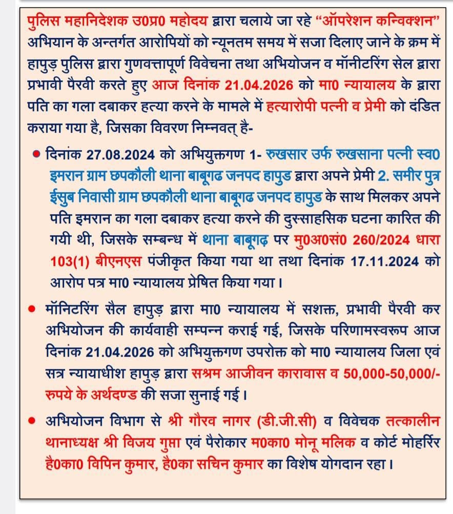 ऑपरेशन कन्विक्शन अभियान के अन्तर्गत आरोपियों को न्यूनतम समय में सजा दिलाए जाने के क्रम में हापुड़ पुलिस द्वारा मा0 न्यायालय में प्रभावी, सशक्त पैरवी करते हुए पति का गला दबाकर हत्या करने के मामले में हत्यारोपी पत्नी व प्रेमी को सश्रम आजीवन कारावास व 50,000-50,000/- हजार रुपये (कुल एक लाख रुपये) के अर्थदण्ड से दंडित कराया गया।अभियुक्त थाना बाबूगढ के गांव छपकौली की रूखसार उर्फ रुखसाना व उसके प्रेमी समीर है।महिला रूखसार ने प्रेमी समीर के साथ मिलकर अपने पति इमरान की गला दबाकर हत्या कर दी थी