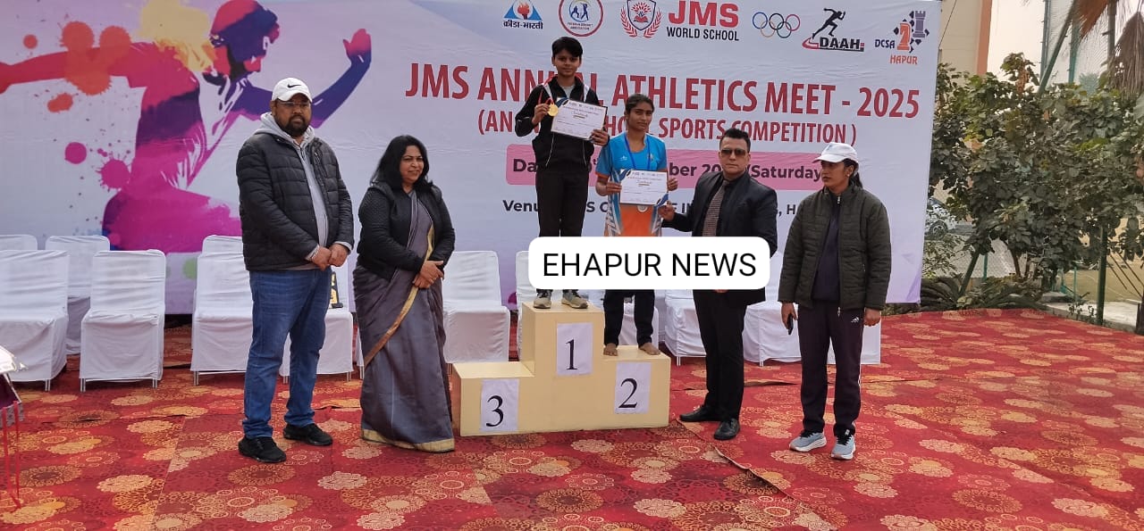 हापुड़, सीमन (ehapurnews.com): जेएमएस वर्ल्ड स्कूल में आयोजित इंटर स्कूल एथलेटिक्स चैंपियनशिप में हापुड़ की प्रीत विहार की रहने वाली यशिका वत्स पुत्री अमित शर्मा ने दो गोल्ड मेडल हासिल किए हैं। अंडर 14 में 100 मी स्प्रिट में एक गोल्ड मेडल हासिल किया है। इस अवसर पर यशिका को बधाई देने वालों का सिलसिला लगातार जारी है। यशिका ने 100 मीटर 14.20 सेकंड में किया और पहली पोजीशन हासिल की। इसी के साथ यशिका ने लॉन्ग जंप में भी शानदार प्रदर्शन किया। अंडर 14 कैटेगरी में 3.95 मीटर जंप करके एक और गोल्ड मेडल झटक लिया। दोनों प्रतियोगिताओं में यशिका वत्स ने एक-एक गोल्ड मेडल हासिल किया। इस अवसर पर उन्हें बधाई देने वालों का सिलसिला लगा है। इससे पहले भी यशिका कई मेडल जीत चुकी है जो लगातार क्षेत्र का नाम रोशन कर रही है। यशिका ने अपने कोच विजय, परिजनों और शिक्षकों को अपनी सफलता का श्रेय दिया है।